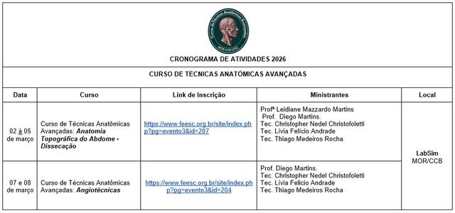 Nos dias 7 e 8 de março/2026, será realizado o Curso de Técnicas Anatômicas Avançadas: Angiotécnicas, ministrado pelo Prof. Diego Martins e pelos Técnicos em Anatomia e Necropsia Christopher Nedel Christofoletti, Lívia Felício Andrade e Thiago Medeiros Rocha. Esse curso tem como objetivo introduzir os participantes aos principais métodos de preenchimento e evidência do sistema vascular em peças anatômicas, utilizando substâncias como látex, silicone e resinas. O conteúdo abrange fundamentos teóricos das angiotécnicas, princípios de injeção vascular, preparo dos materiais e aspectos de biossegurança, aliados à prática de dissecação, injeção e conservação das peças.