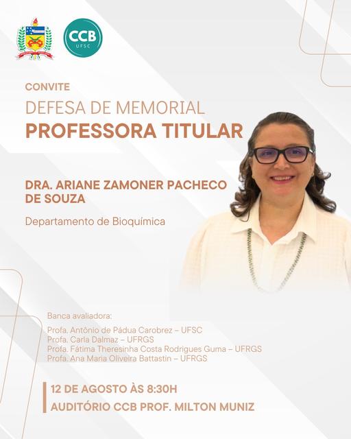 A Direção do Centro de Ciências Biológicas convida a todos para assistirem a apresentação de defesa do Memorial de Atividades Acadêmicas (MAA), visando a promoção para a Classe E (Titular de Carreira) da professora ARIANE ZAMONER PACHECO DE SOUZA, do Departamento de Bioquimica (BQA/CCB), no dia 12/08/2025, às 8h30min, no Auditório Milton Muniz, Centro de Ciências Biológicas, UFSC.